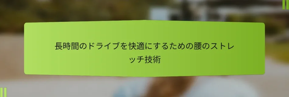 長時間の運転中に腰の不快感を感じることは一般的な問題であり、筋肉の疲労や悪い姿勢などの要因によって引き起こされることがよくあります。効果的なストレッチ技術を取り入れることで、緊張を和らげ、柔軟性を向上させ、旅行体験をより快適にすることができます。定期的なストレッチは不快感を軽減するだけでなく、血行を改善し、より楽しい旅を実現します。 長時間の運転中に腰の不快感を引き起こす原因は何ですか? 長時間の運転中に腰の不快感は、筋肉の疲労、悪い姿勢、運動不足、既存の病状など、さまざまな要因から生じることがあります。これらの原因を理解することで、不快感を軽減し、運転の快適さを向上させるための効果的な戦略を実施するのに役立ちます。 長時間の座位による筋肉の疲労 長時間の座位は、特に腰の筋肉に疲労を引き起こす可能性があります。長時間座っていると、脊椎を支える筋肉が緊張し、疲労することがあります。この疲労は、車のシートからのサポートが不足していることで悪化することがよくあります。 筋肉の疲労を軽減するために、毎時休憩を取り、立ち上がったり、ストレッチをしたり、歩き回ったりすることを検討してください。腰や股関節をターゲットにしたシンプルなストレッチは、緊張を和らげ、血行を改善するのに役立ちます。 悪い姿勢と人間工学的要因 運転中の悪い姿勢は、腰痛に大きく寄与する可能性があります。前かがみになったり、前に傾いたりすると、脊椎や周囲の筋肉に過度のストレスがかかります。また、適切に調整されていないシートは、背中に負担をかける不自然な角度を引き起こすことがあります。 より良い姿勢を促進するために、膝が股関節より少し高くなるようにシートを調整し、背中をシートにまっすぐに保つようにしてください。腰のサポートや丸めたタオルを使用することも、脊椎の自然なカーブを維持するのに役立ちます。 運動不足と血行不良 同じ姿勢を長時間維持することは、血行を妨げ、腰に硬直感や不快感を引き起こす可能性があります。運動は柔軟性を維持し、筋肉の緊張を減らすために不可欠です。 運転ルーチンに定期的な動きを取り入れましょう。体重を移動させたり、つま先を動かしたり、座ったままでツイストを行ったりするなどのシンプルな動作は、血行を促進します。数時間ごとに立ち上がってストレッチや歩き回ることを目指しましょう。 既存の病状が背中に与える影響 椎間板ヘルニア、関節炎、坐骨神経痛などの既存の病状を持つ人は、長時間の運転中に不快感が増すことがあります。これらの状態は、長時間の座位や悪い姿勢の影響を増幅させることがあります。 既知の背中の病状がある場合は、旅行中の不快感を管理するための具体的なアドバイスを得るために、医療専門家に相談してください。痛みを軽減するために、特定の運動や車両の人間工学的調整を推奨されることがあります。 車両のデザインが背中の健康に与える影響 車両のデザインは、長時間の運転中の背中の健康に大きな影響を与える可能性があります。十分な腰のサポートがないシートや不適切に設計されたシートは、不快感を引き起こし、既存の問題を悪化させることがあります。 車両を選ぶ際は、腰のサポートや人間工学的機能を提供する調整可能なシートを備えたモデルを検討してください。購入前にシートの位置をテストして、自分の体に合い、運転中に健康的な姿勢を促進することを確認してください。 長時間の運転中の快適さのための効果的な腰のストレッチ技術は何ですか? 効果的な腰のストレッチ技術は、緊張を和らげ、柔軟性を向上させることで、長時間の運転中の快適さを大幅に向上させることができます。特定のストレッチを取り入れることで、硬直感や不快感を防ぎ、より楽しい旅行体験を実現できます。 腰の緩和のための座った状態でのスパイナルツイスト 座った状態でのスパイナルツイストは、腰をターゲットにした穏やかなストレッチで、緊張を和らげるのに役立ちます。このストレッチを行うには、床に座り、脚を伸ばし、一方の膝を曲げて、その足を反対側の太ももの外側に置きます。次に、曲げた膝の方に上半身をひねり、反対側の腕を使ってストレッチを深めます。 利点: 脊椎の可動性を高め、腰の緊張を軽減します。 ヒント: 最適な結果を得るために、各側で15-30秒間ストレッチを保持してください。 柔軟性のための立った状態でのハムストリングストレッチ 立った状態でのハムストリングストレッチは、腰と脚の柔軟性を改善するのに効果的です。足を腰幅に開いて立ち、背中をまっすぐに保ちながら腰を曲げ、つま先に向かって手を伸ばします。このストレッチは、長時間の運転中の休憩中に簡単に行うことができます。 利点: ハムストリングの柔軟性を高め、腰への圧力を軽減します。 ヒント: バウンスを避け、20-30秒間安定してストレッチを保持してください。 リラク