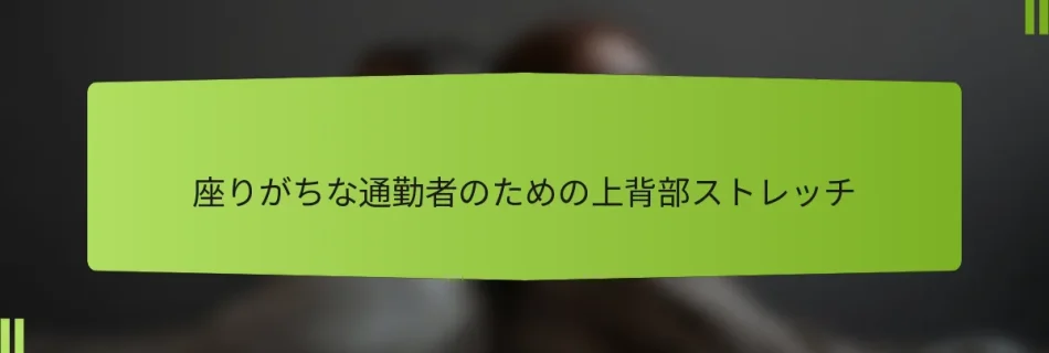 座りがちな通勤者にとって、上背部の痛みは長時間の座位や悪い姿勢から生じることが多く、筋肉の緊張や不快感を引き起こします。定期的に上背部をストレッチすることで、この緊張を和らげ、姿勢を改善し、全体的な健康を向上させることができるため、長時間運転したりデスクに座ったりする人にとって重要な習慣となります。 座りがちな通勤者における上背部痛の一般的な原因は何ですか? 座りがちな通勤者の上背部痛は、長時間の座位、悪い姿勢、ストレスから生じることが多いです。これらの要因は、特に上背部の筋肉に緊張や不快感を引き起こすため、その影響を理解し、効果的な緩和策を見つけることが重要です。 長時間の座位が上背部の筋肉に与える影響 長時間の座位は上背部の筋肉を著しく弱め、不快感や痛みを引き起こす可能性があります。長時間座っていると、筋肉が硬くなり柔軟性を失い、緊張や痛みが悪化することがあります。 さらに、座っていると脊椎が圧迫され、上背部の筋肉や靭帯に負担がかかります。この圧迫は痛みの悪循環を引き起こす可能性があり、不快感が動きを妨げ、筋肉をさらに弱めることになります。 これらの影響を軽減するためには、定期的に休憩を取り、ストレッチを日常に取り入れることが重要です。毎時間数分間立ったり歩いたりして血流を促進し、筋肉の緊張を和らげることを目指しましょう。 通勤に関連する姿勢の問題 通勤中の悪い姿勢は、上背部痛の一般的な要因です。多くの通勤者は、特にモバイルデバイスやノートパソコンを使用しているときに、猫背になったり前かがみになったりします。この姿勢は上背部の筋肉や脊椎に過度なストレスをかけます。 中立的な脊椎の位置を維持することは、負担を軽減するために重要です。座っているときは、背中がサポートされ、肩がリラックスしていることを確認してください。座席を調整したり、腰のサポートを使用したりすることで、通勤中の正しい姿勢を維持するのに役立ちます。 座っているときだけでなく、立っているときや歩いているときにも姿勢に気を付けましょう。定期的に自分の体を確認することで、良い習慣を強化し、不快感を防ぐことができます。 ストレスと緊張が上背部に与える影響 ストレスや緊張は上背部に身体的に現れ、緊張や痛みを引き起こすことがあります。ストレスを感じているとき、人は無意識に肩や背中の筋肉を緊張させることが多く、これが時間の経過とともに不快感を生むことがあります。 深呼吸、瞑想、ヨガなどのリラクゼーション技術を取り入れることで、この緊張を和らげることができます。これらの実践はリラクゼーションを促進し、ストレスに関連する身体的症状を軽減することができます。 さらに、定期的な身体活動はストレスレベルを管理し、全体的な筋肉の健康を改善するのに役立ちます。ウォーキングや水泳など、身体的および精神的な健康を促進する活動を目指しましょう。 座りがちなライフスタイルと上背部の不快感の関連性 座りがちなライフスタイルは上背部の不快感と密接に関連しています。動かないことは筋肉を弱め、柔軟性を低下させ、上背部が痛みに対してより敏感になります。 定期的な運動は筋肉の強さと柔軟性を維持するために重要です。上背部をターゲットにした運動、例えばレジスタンストレーニングや水泳を取り入れて、筋力を高め、不快感を軽減しましょう。 エレベーターの代わりに階段を使ったり、休憩中に短い散歩をしたりするなどの簡単な変更でも、よりアクティブなライフスタイルに貢献し、上背部の痛みを和らげることができます。 上背部痛におけるエルゴノミクスの役割 エルゴノミクスは通勤者の上背部痛を予防する上で重要な役割を果たします。適切な作業環境の設定や座席の配置は、上背部への負担を大幅に軽減することができます。 椅子が腰をサポートし、コンピュータの画面が目の高さにあることを確認して、中立的な脊椎の姿勢を維持しましょう。キーボードトレイやフットレストなどのエルゴノミクスアクセサリーを使用することも、長時間の通勤中の快適さを向上させるのに役立ちます。 車内や公共交通機関での通勤環境を定期的に評価し、潜在的なエルゴノミクスの改善点を特定しましょう。小さな調整でも、時間の経過とともに上背部の不快感を大幅に軽減することができます。 上背部のストレッチは通勤者の不快感をどのように和らげることができますか? 上背部のストレッチは、筋肉の緊張を軽減し、姿勢を改善することで、通勤者の不快感を大幅に和らげることができます。定期的なストレッチは血液循環を促進し、柔軟性を高め、長期的な痛みの緩和につながります。 筋肉の緩和におけるストレッチのメカニズム ストレッチは筋肉繊維を伸ばすことで機能し、蓄積された緊張を解放します。筋肉が伸ばされると、リラックスし、長時間座った後にしばしば感じる緊張や不快感が